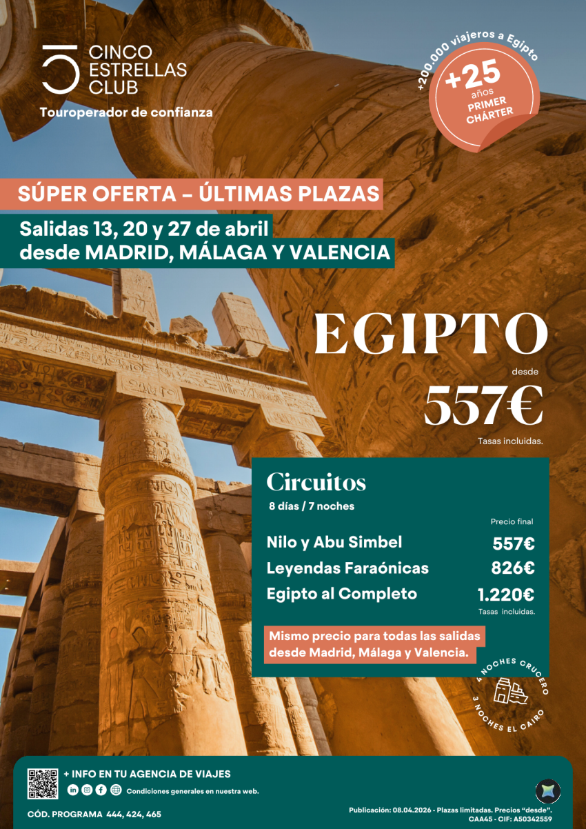 Súperoferta/ últimas plazas /Egipto desde 557€ salidas abril:13,20,27 desde Madrid, Málaga y Valencia
