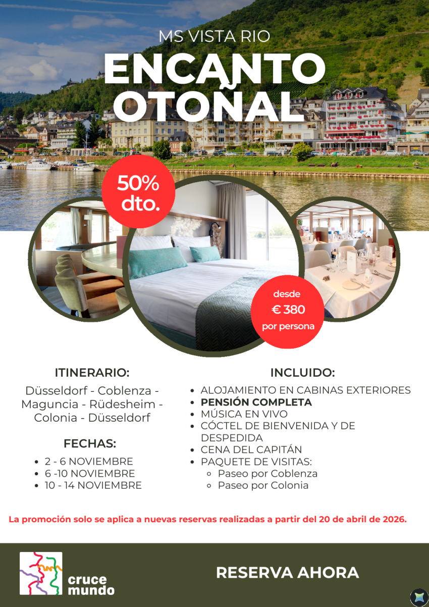 Colores de otoño en el Rin. 5 días a bordo de MS VistaRio. 50% de descuento con visitas.